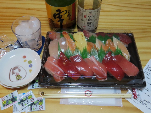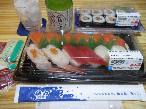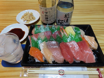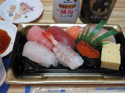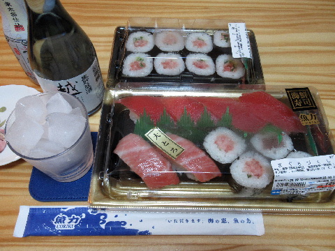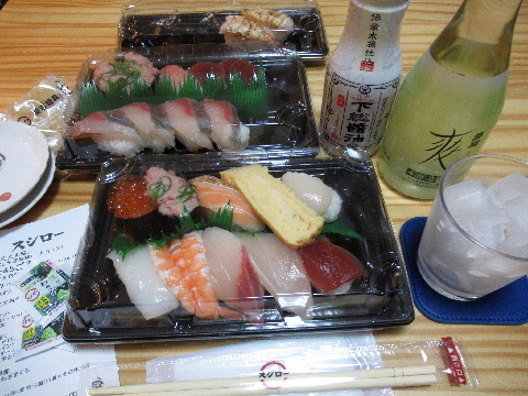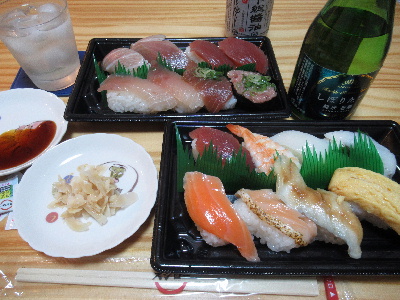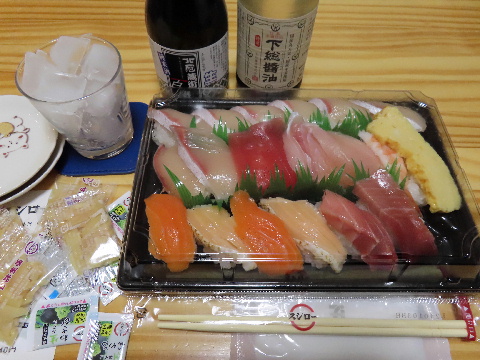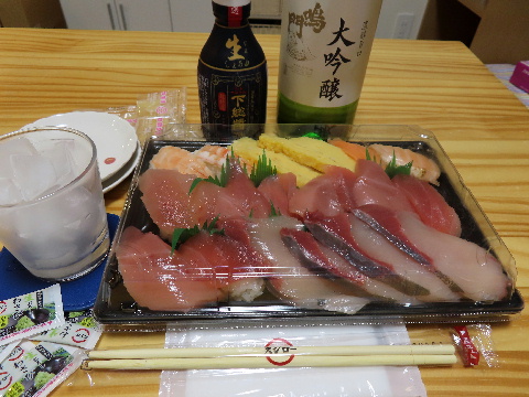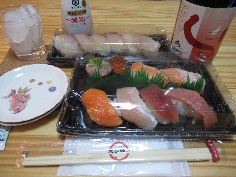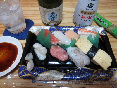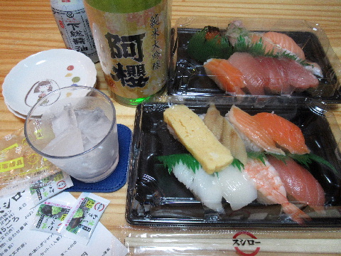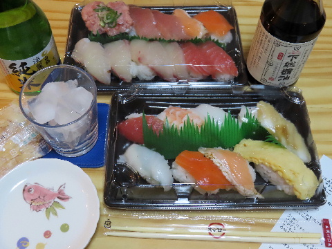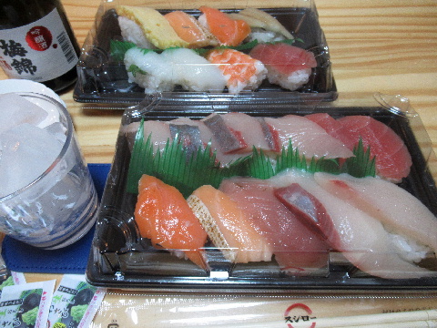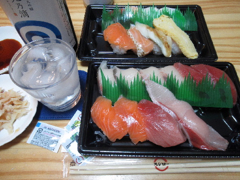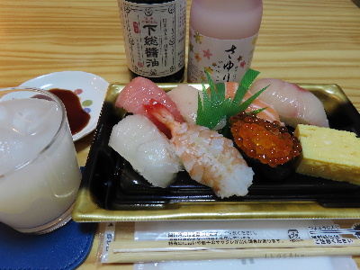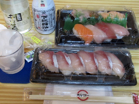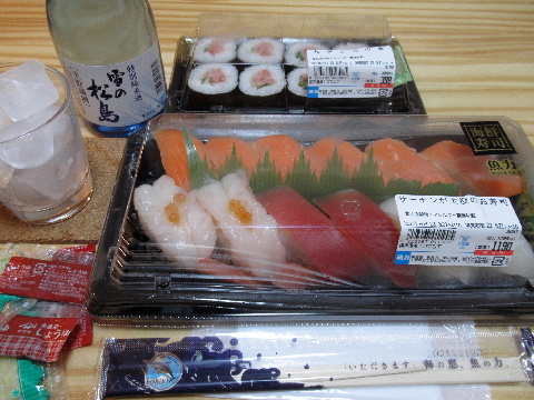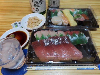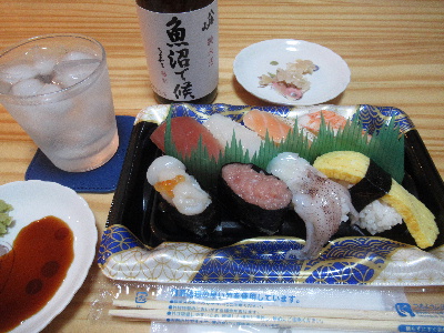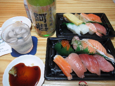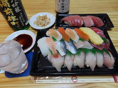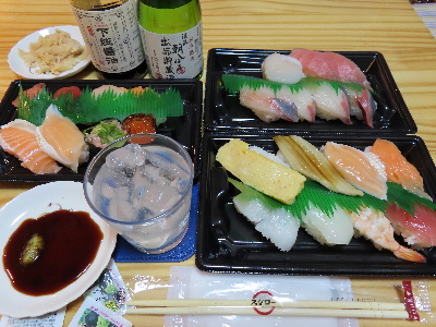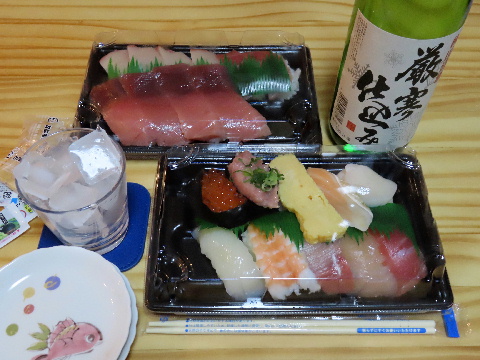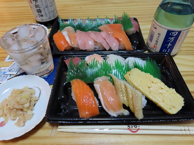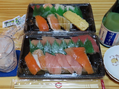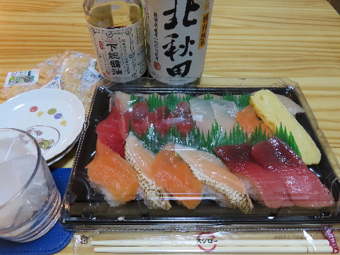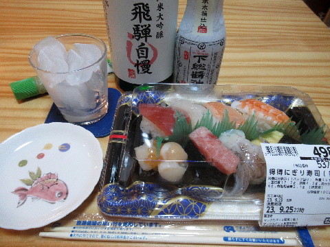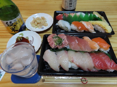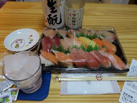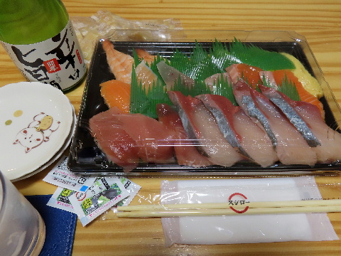 この日の晩酌はここで買った寿司をつまみに日本酒を呑む。