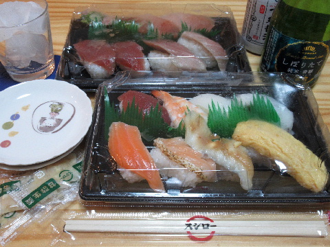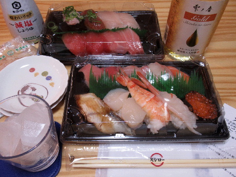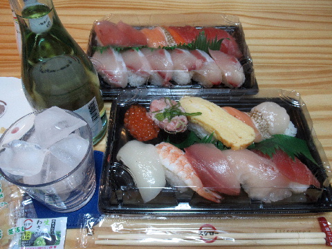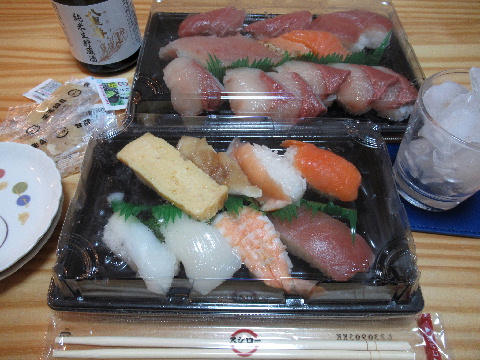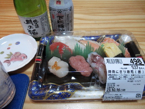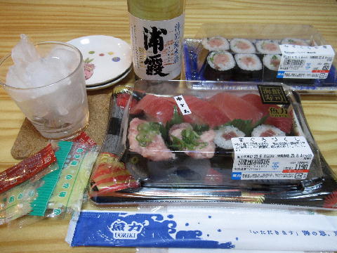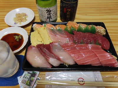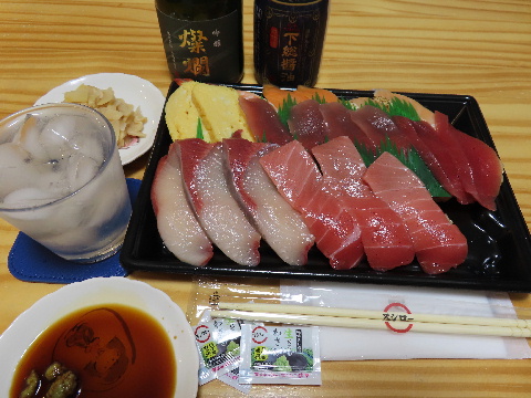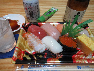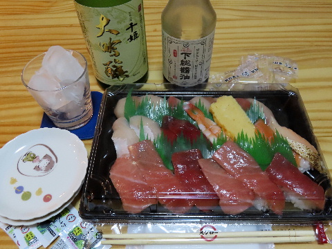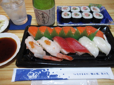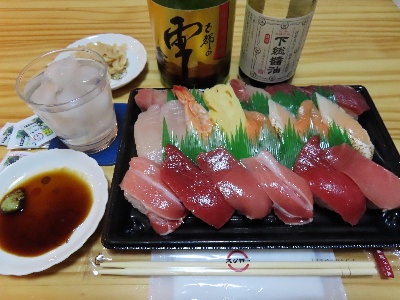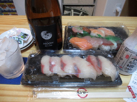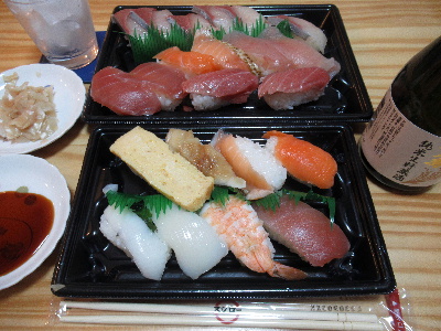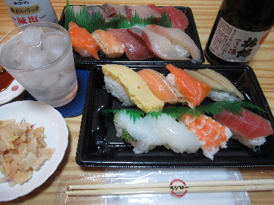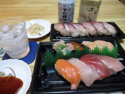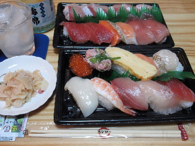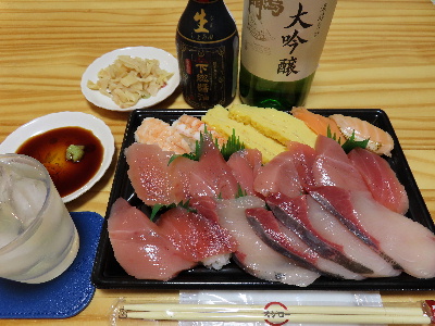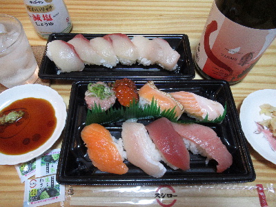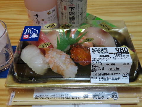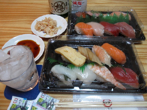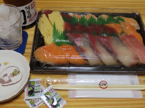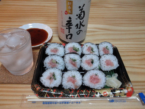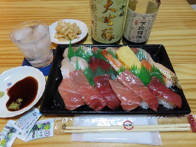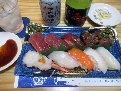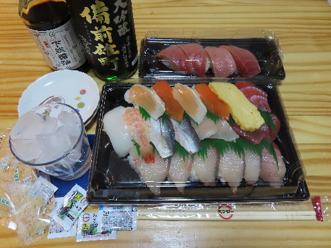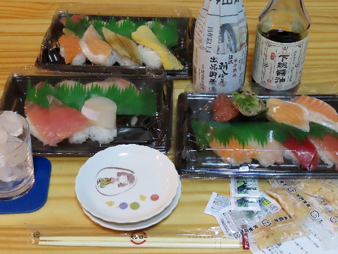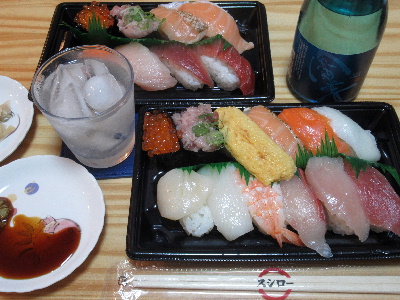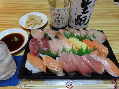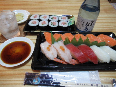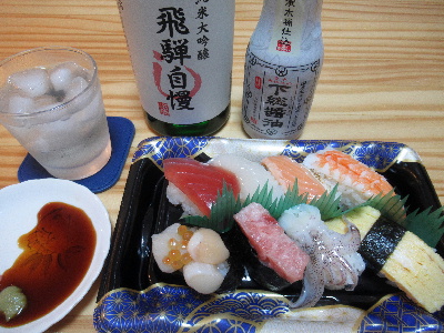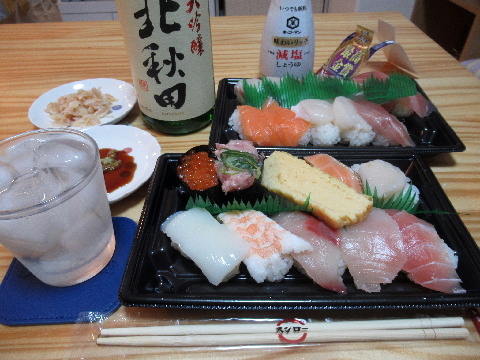 この日の晩酌はここで買った寿司をつまみに日本酒を呑む。