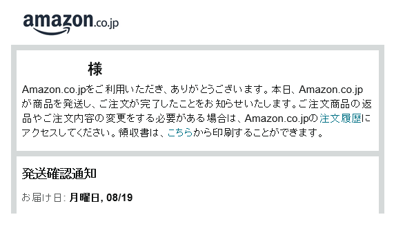 発注確認通知で「お届け日 月曜日、08/19」となっていた。
