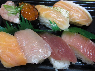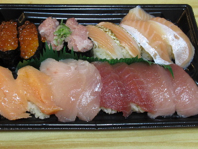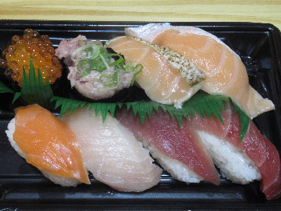 サーモンのにぎりが6貫と、イカ、マグロ、イクラの乗った海老が2貫ずつ付く。