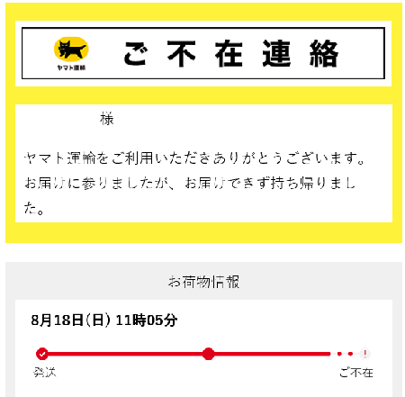8月18日日曜日に「ご不在連絡票」がポストに入っていた。