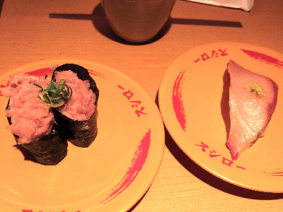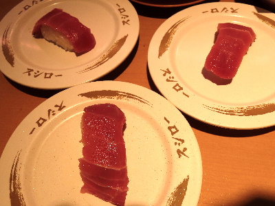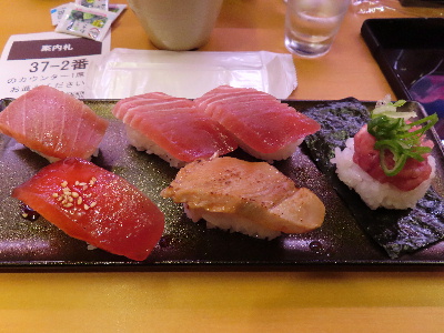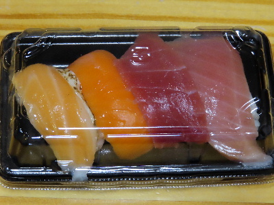 中とろ、まぐろ、サーモン、焼とろサーモンが各1貫ずつ。