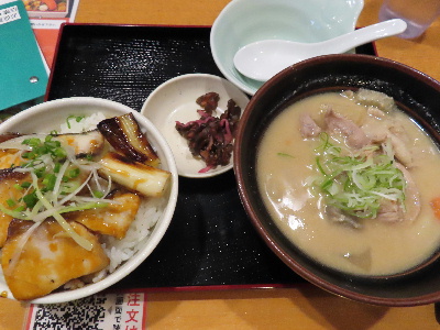 「大衆食堂定食のまる大・東船橋店」の鰤照り焼き丼と豚汁